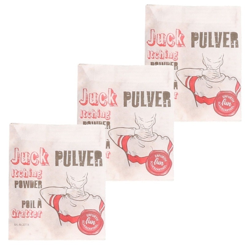 3x jeukpoeder in een zakje. Laat vrienden en familie schateren van het lachen met dit zakje jeukpoeder, een klassiek fopartikel voor grappen en grollen. Perfect voor feestjes, thema-avonden, of om iemand eens goed te foppen!