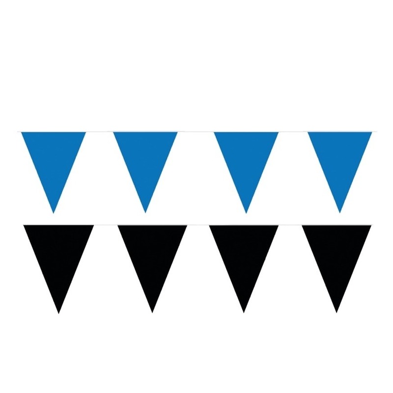 Zwart en blauwe vlaggetjes pakket. Totaal 120 meter vlaggetjes. Materiaal: plastic. , Dit artikel bestaat uit:, 6x Party Vlaggenlijn puntvlaggetjes – kunststof – blauw – 10 meter – Slinger – versiering, 6x Party Vlaggenlijn puntvlaggetjes – kunststof – zwart – 10 meter – Slinger – versiering