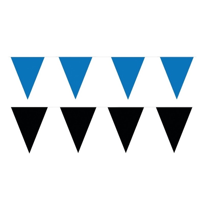 Zwart en blauwe vlaggetjes pakket. Totaal 60 meter vlaggetjes. Materiaal: plastic. , Dit artikel bestaat uit:, 3x Party Vlaggenlijn puntvlaggetjes – kunststof – blauw – 10 meter – Slinger – versiering, 3x Party Vlaggenlijn puntvlaggetjes – kunststof – zwart – 10 meter – Slinger – versiering