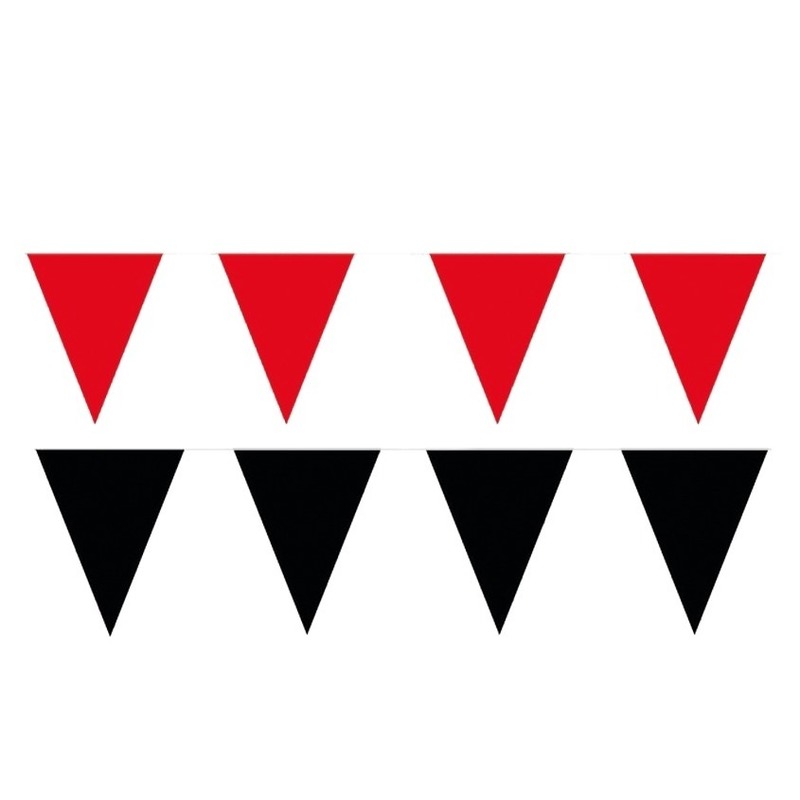 Zwart en rode vlaggetjes pakket. Totaal 80 meter vlaggetjes. Materiaal: plastic. , Dit artikel bestaat uit:, 4x Party Vlaggenlijn puntvlaggetjes – kunststof – rood – 10 meter – Slinger – versiering, 4x Party Vlaggenlijn puntvlaggetjes – kunststof – zwart – 10 meter – Slinger – versiering