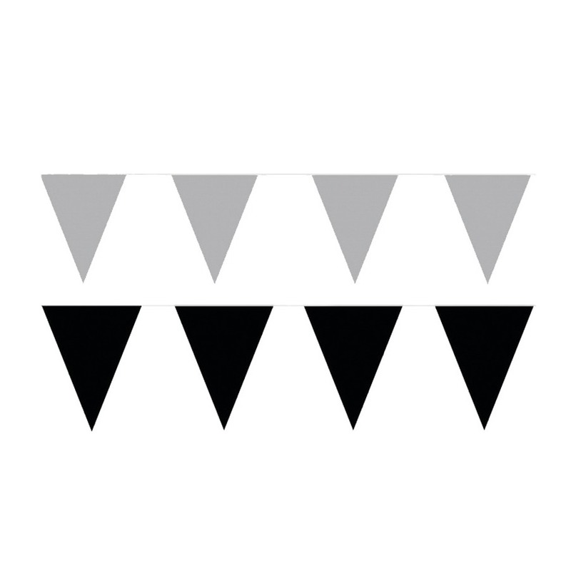 Zwart en zilveren vlaggetjes pakket. Totaal 120 meter vlaggetjes. Materiaal: plastic. , Dit artikel bestaat uit:, 6x Party Vlaggenlijn puntvlaggetjes – kunststof – zilver – 10 meter – Slinger – versiering, 6x Party Vlaggenlijn puntvlaggetjes – kunststof – zwart – 10 meter – Slinger – versiering